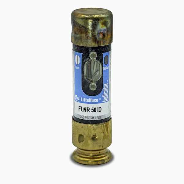 Fuse, 50 A, 250 V AC, 125 V DC, Class RK5, FLNR-ID Series, Indicating, Time-Delay, Body Style Cylindrical, Fits Fuse Block Style Rejection, Fuse Size 3 in L x 0.81 in dia, Length 3 in, Diameter 13/16 in, Equivalent Brand and Series Littelfuse FLNR-ID, Equivalent Series FLNR-ID, Compatible Fuse Block Series LFR25, Dual Element, Standards CSA, cUL, UL