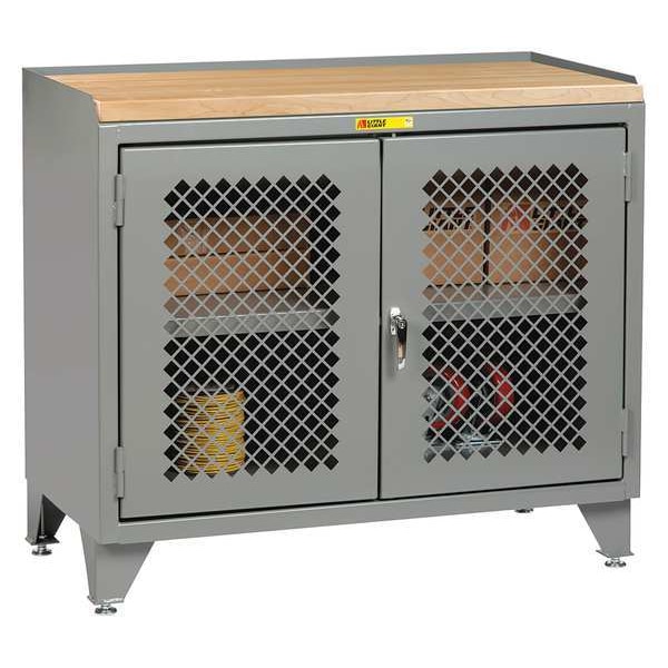 Cabinet Workbench, Top Material Butcher Block, Color Gray, Non-Metal Top Thickness 1 3/4 in, Number of Doors 2, Number of Drawers 0, Number of Shelves 1, Overall Depth 24 in, Overall Height 42 1/2 in, Overall Load Capacity 2,000 lb, Overall Width 48 in, Top Metal Material Gauge Not Applicable, Included Components Lower Shelf, Assembly Fully Assembled, Brake Type None, Cabinet Interior Depth 23 in, Caster Mount Type Not Applicable, Caster Type Not Applicable, Door Type Ventilated Openings