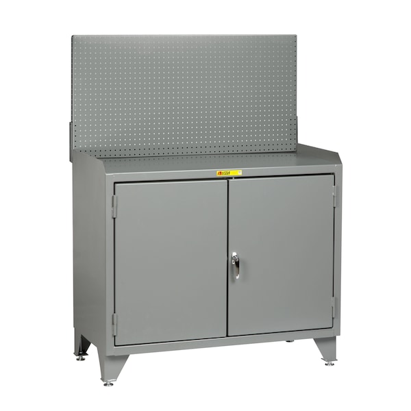 Counter Height Bench Cabinet, 36"W, Solid Doors, Steel Top, Pegboard