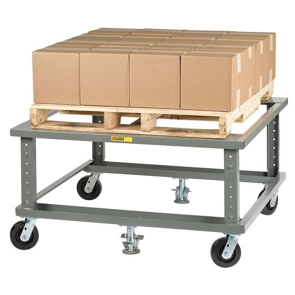 Ergonomic Adjustable-Height Open Deck Steel Pallet Dolly, Load Capacity 3,600 lb, Deck Length 48 in, Deck Width 48 in, Deck Height 24 to 34 in, Deck Profile Flush, Deck Surface Smooth, Deck Type Open, For Pallet Type Closed/Open, Center Opening Length 45 in, Center Opening Width 27 in, Maximum Deck Height 34 in, Minimum Deck Height 24 in, Frame Material Steel, Frame Finish Powder Coated, Caster Wheel Dia. 6 in, Caster/Roller Configuration (4) Swivel with Floor Lock, Color Gray