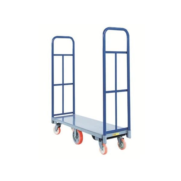 Narrow 16-inch wide steel deck is ideal for busy aisles, or 24-inch for more loading capacity. Six wheel design is fully maneuverable with two 8” x 2” rigid center wheels with roller bearings, and four 5-inch corner mounted swivel casters with ball bearing wheels. All wheels are non-marking polyurethane tread for added maneuverability. Two removable pipe handles extend 48” above the deck for taller loads, which means fewer trips.