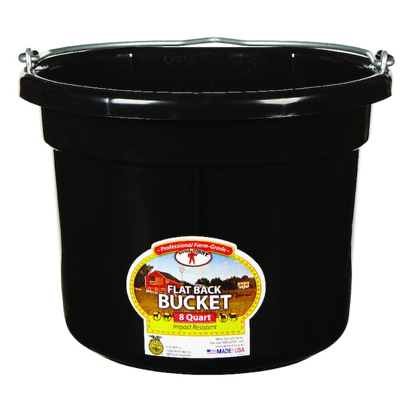 Little Giant flat-back buckets are a favorite on farms and ranches everywhere. The flat-back fits more compactly for hanging against a wall or fence, plus it makes hauling heavy loads a lot easier. Our buckets are made from polyethylene resin that is impact resistant, protects against warpage and helps prevent stress cracks. This bucket features a heavy-duty wire bail with notch for hanging and stacking ribs so the pails come part easier when stacked. 11.5 inch long by 12 inch wide by 9 inch high, holds 8 quarts (2 gallons).