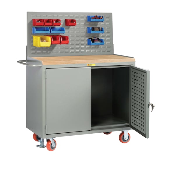 Mobile Bench Cabinet, 36"W, Louvered Panel Doors, Butcher Block, Louvered
