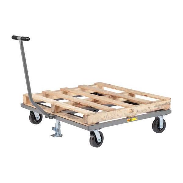Open-Deck Steel Pallet Dolly with Handle, Load Capacity 3,600 lb, Deck Length 48 in, Deck Width 48 in, Deck Height 9 in, Deck Profile Flush, Deck Surface Smooth, Deck Type Open, For Pallet Type Closed/Open, Center Opening Length 45 in, Center Opening Width 27 in, Maximum Deck Height 9 in, Minimum Deck Height 9 in, Frame Material Steel, Frame Finish Powder Coated, Caster Wheel Dia. 6 in, Caster/Roller Configuration (2) Swivel, (2) Axle-Mounted with Floor Lock, Color Gray, Overall Length 48 in