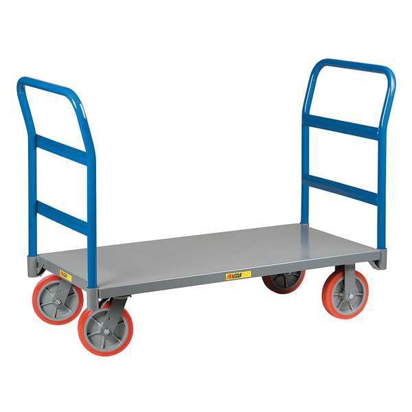Dual-Handle Steel-Deck Platform Truck, Load Capacity 3,600 lb, Overall Height 40 in, Overall Length 64 in, Overall Width 30 in, Deck Construction Solid, Deck Material Steel, Deck Finish/Coating Powder Coated, Deck Gauge 12 ga, Deck Height 11 in, Deck Length 60 in, Deck Width 30 in, Deck Surface Smooth, Frame Material Steel, Frame Finish/Coating Powder Coated, Handle Type (2) Removable Raised, Lip Style Flush, Side Panel Type No Side Panels, Number of Platforms 1, Color Blue, Gray