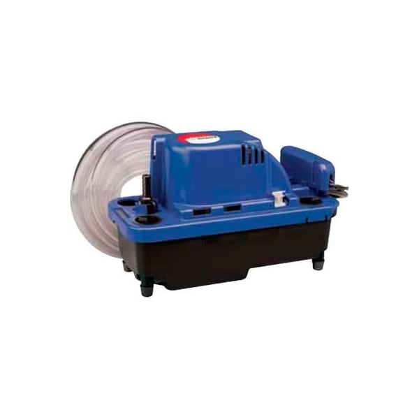 The vcmx-20ulst is designed for condensate removal where gravity drainage is not available for air conditioning or high efficiency gas furnaces systems. It includes a safety switch to prevent overflow of the tank in case of blockage in the discharge line and 20' of 3/8in i.d. Vinyl discharge tubing. It features an oil resistant tank, stainless steel motor shaft and flexible installation options. Features a built-in check valve. -turn check valve allows servicing without removal of tubing; eliminates water spills patent-pending cooling design improved cooling increases pump life overflow safety switch rubber feet absorbs vibration on hard surface installations. external test/run lever quick test/run lever & easy drainage of tank for servicing oil-resistant tank and check valve eliminate problem of cracked tank with exposure to oil 2 year limited warranty.