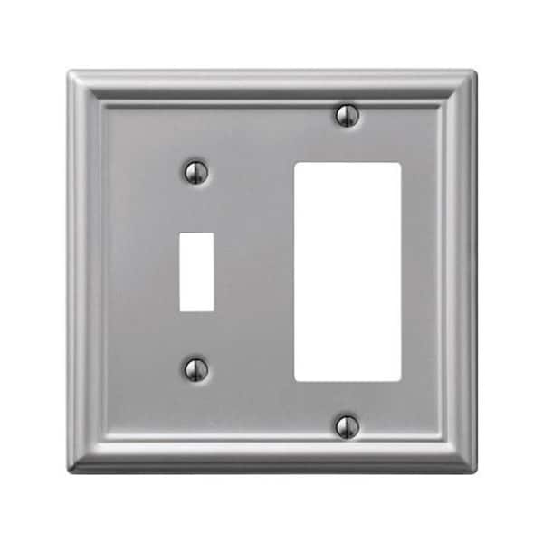 Features -Chelsea 1 Toggle & 1 Rocker-GFCI Wall Plate -1 toggle and 1 rocker/GFCI combination -Finish: Brushed nickel -Stamped steel -Complements bath and lighting fixtures -Includes matching screws -Durable and easy to clean steel Specifications - Dimension: 7.5 H x 5.9 W x 0.4 L - Weight: 0.3 lbs