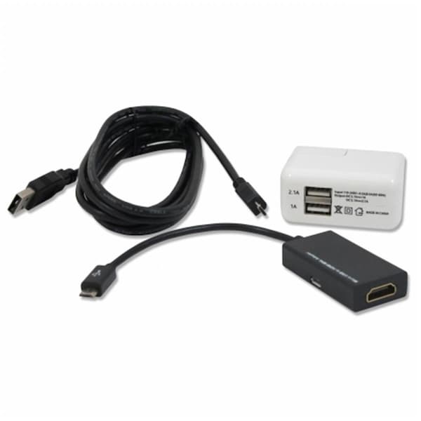 Features -Conveniently compiles all the necessary cables adapters and accessories for connecting your device into one convenient kit. -Perfect for Systems Integration Education Government & Professionals on-the-go. -Extend your MHL enabled phone or tablet s display to a HDMI HDTV. -MHL Adapter includes Micro B female connector for charging your phone or tablet while using the adapter. -Compatible charging with all USB 1A or 2.1A devices. -Flexible and portable for many environments. -Includes:. -USB Micro to HDMI MHL Adapter. -6ft Micro USB Cable. -Dual USB Wall Charger 2.1A/12 Watt. -Cable Tie.