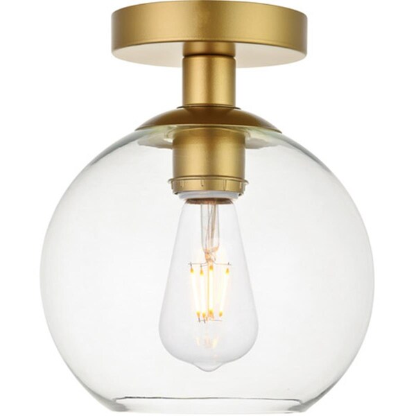 Refined style with a practical design Baxter flush-mount ceiling lamps bring cosmopolitan sophistication anywhere especially to an entryway hallway bathroom kitchen or closet. The smooth iron frame features a disk-shaped canopy and comes in a brass finish. The clear spherical glass shade remains open at the center to allow for effortless replacement of the filament-style bulb not included. Living in the big city has never been this easy. Specifications - Collection: Baxter - Finish: Brass - Shade: Clear Ball Glass - Wire Color: Black and White - Style: Midcentury Modern - Material: Iron/Glass - Bulbs Included: No - Primary Bulbs: 1 x 40 watts E26 Medium - Voltage: 110-125V - Shade Dimensions: 7.1in H x 7.9in W - Weight: 2.8 lbs