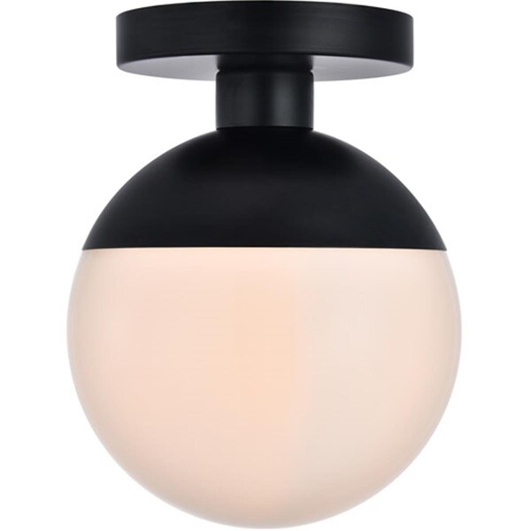 Refined style with a practical design Eclipse flush mount bring cosmopolitan sophistication anywhere especially to an entryway office bathroom bedroom or kitchen.The smooth iron frame features a disk-shaped canopy and in a black finish.A touch of color on top of the frosted white spherical glass shade brings character to this classic style.Living in the big city has never been this easy.Features.Flush mount features a black and frosted white glass.Glass shade width of 8 inches with a height of 7.5 inches.Decorative black 'top hat' caps the shade.Requires a standard bulb or LED E26 bulb not included.no assembly required.clean sleek design Usages.Entryway office bathroom bedroom or kitchen Specifications.Collection: Eclipse.Finish: Black & frosted White.Style: Midcentury Modern.Fixture Material: Metal & Glass.Assembly Required: No.Lighting Shade Included: Yes.Lighting Shade Material: Glass.Lighting Shade Color: Frosted White.Lighting Shade Shape: Round.Lighting Canopy: Yes.Lighting Voltage: 110V-125V.Safety Rating: UL ULC.Number of Tiers: 1.Maximum Wattage: 40W.Bulb Wattage: 40W.Lighting Dimmable: Yes.Lighting Socket Type: E26.Number of Lights: 1.Light Direction: Down.Lighting Wire Color: Black & white.Lighting Wire Size: 10 in..Lighting Hanging Device Adjustable: No.Lighting Canopy Dimension: 1in H x 6in W x 6in L.Lighting Shade Size: 7.5in H x 8in W.Dimension: 10in H x 8in W x 8in L.Weight: 4.2 lbs