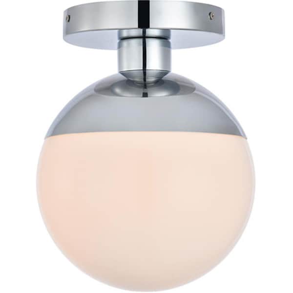 Refined style with a practical design Eclipse flush mount bring cosmopolitan sophistication anywhere especially to an entryway office bathroom bedroom or kitchen.The smooth iron frame features a disk-shaped canopy and in a chrome finish.A touch of color on top of the frosted white spherical glass shade brings character to this classic style.Living in the big city has never been this easy.Features.Flush mount features a black and frosted white glass.Glass shade width of 8 inches with a height of 7.5 inches.Decorative chrome 'top hat' caps the shade.Requires a standard bulb or LED E26 bulb not included.no assembly required.clean sleek design Usages.Entryway office bathroom bedroom or kitchen Specifications.Collection: Eclipse.Finish: Chrome & frosted White.Style: Midcentury Modern.Fixture Material: Metal & Glass.Assembly Required: No.Lighting Shade Included: Yes.Lighting Shade Material: Glass.Lighting Shade Color: Frosted White.Lighting Shade Shape: Round.Lighting Canopy: Yes.Lighting Voltage: 110V-125V.Safety Rating: UL ULC.Number of Tiers: 1.Maximum Wattage: 40W.Bulb Wattage: 40W.Lighting Dimmable: Yes.Lighting Socket Type: E26.Number of Lights: 1.Light Direction: Down.Lighting Wire Color: Black & white.Lighting Wire Size: 10 in..Lighting Hanging Device Adjustable: No.Lighting Canopy Dimension: 1in H x 6in W x 6in L.Lighting Shade Size: 7.5in H x 8in W.Dimension: 10in H x 8in W x 8in L.Weight: 4.2 lbs