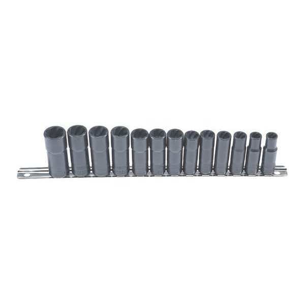 (9) 3/8" Drive Deep Well Twist Sockets: 10mm,11mm,12mm,13mm,14mm,15mm,16mm,17mm,19mm; (4) 3/8" Deep Well Twist Sockets: 3/8",1/2",9/16",11/16"