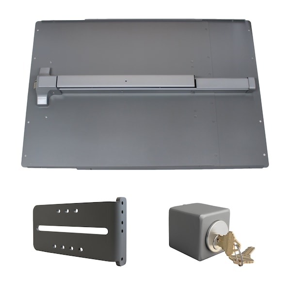 Kit Includes: Panic Shield, PB1100FR Fire Rated Panic Bar, PSSB Strike Bracket, PSGB5 Key Box, Key Cylinder