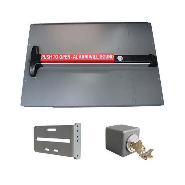 Kit Includes: Panic Shield, Detex V-40xEBxWx711x48 42 Black Weatherized Alarm Panic Bar, PSSB Strike Bracket, PSGB5 Key Box, Key Cylinder