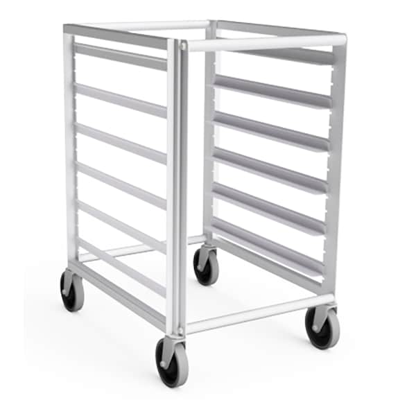 All aluminum construction. 6 removable 1.5" tray slides provides 4.5" spacing adjustable at 1.5" intervals. 5" casters. Ships knocked down for freight savings - easy assembly. ETL listed