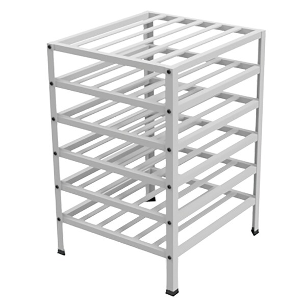 All aluminum construction. Sturdy space saving design - occupies less than 4 square feet of floor space. 6 shelves hold bottles cork view, 6 bottles wide by 2 bottles deep. 4.5" opening between shelves. Ships knocked down freight savings - easy assembly