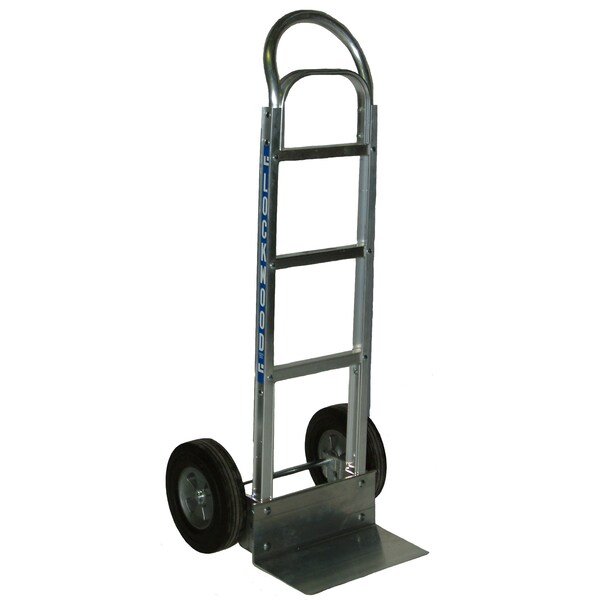 All aluminum construction. 500 lb capacity. Kick back loop handle. 14" noseplate. 10" semi pneumatic tires require no air and are ideal for flat hard surfaces. Ships fully assembled