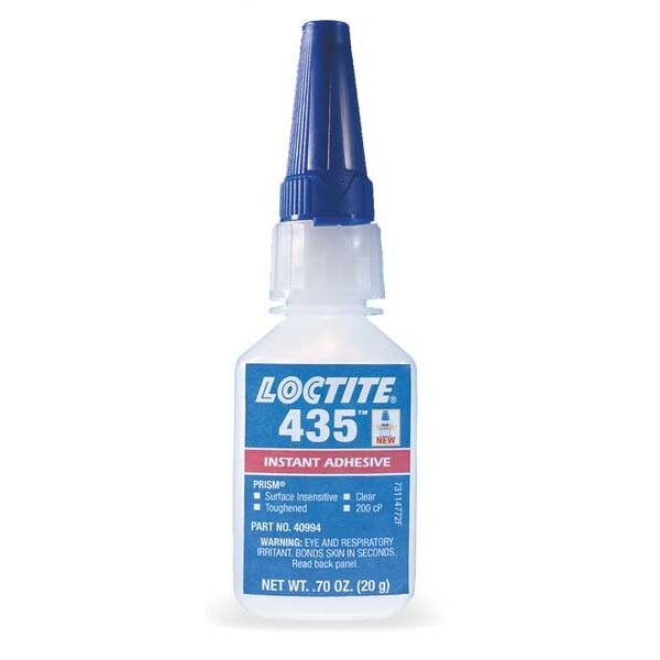 Instant Adhesive, Adhesive Color Clear, Container Size 0.7 fl oz, Container Type Bottle, Cure Method Humidity, Maximum Viscosity 175 cP, Minimum Viscosity 175 cps, Series 435, Built-in Dispenser Type No Dispenser/Applicator, Compatible Accelerator Loctite SF 712, Features Solvent Free, Toughened Humidity Cured, Materials Bonded Metal, Plastic, Rubber, Primary Applications Plastics, Standards 29 CFR 1910.1200, Electrically Insulating Yes, Gap Fill 0.006 in, Impact Resistant No