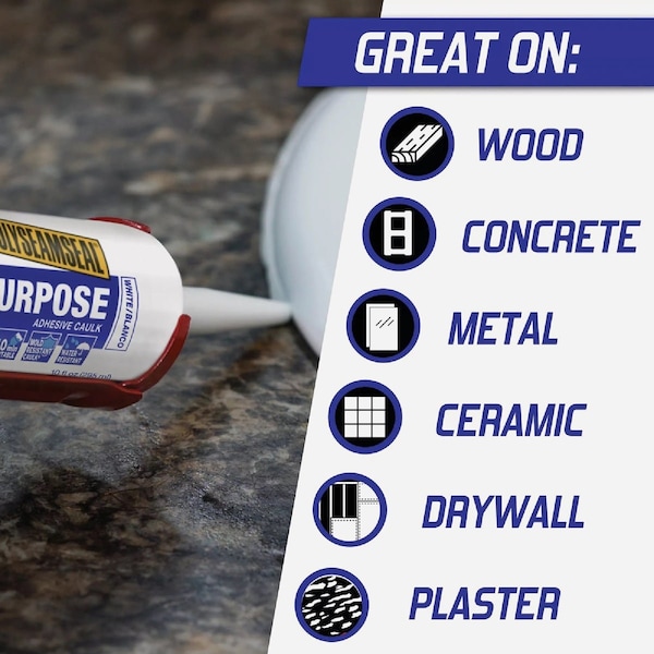 LOCTITE Polyseamseal All-Purpose Adhesive Caulk is formulated for bonding and sealing projects in and around the house. The Seal & Bond technology provides increased durability for a long lasting flexible seal. Easy to apply and tool and the cured product is mold and mildew resistant seal water resistant and permanently flexible paintable in 40 minutes and water clean up. Can be used for almost any household or remodeling project including gluing loose molding or tiles securing backsplashes setting sinks and repairing or concealing small cracks in plaster drywall or around molding and baseboards. Can help to lower energy costs by sealing air leaks around windows doors and other utility and plumbing penetrations. Bonds to wood concrete metal ceramic drywall plaster tiles and more. For best results: apply and store at temperatures between 40 degree F (5 degree C) and 100 degree F (38 degree C). Not suitable for continuous water immersion - under shower door tracks below water line on mirrors in aquariums or on 2 non-porous surfaces. Not for use in butt joints architectural joints joints subject to heavy abrasion wear or tuck pointing. Maximum joint depth is 1/4 In. (6.3 mm) and joint width is 1/2 In. (12.7 mm). Do not use on unfinished or unprimed fiber cement. Coverage: 5.5 Oz. Size - 16.9 Ft. at 1/4 In. bead 7.5 Ft. at 3/8 In. bead. 10 Oz. Size - 30.6 Ft. at 1/4 In. bead 13.8 Ft. at 3/8 In. bead. Shelf Life: 5 Oz. Size - 18 mo from manufacture date. 10 Oz. Size - 24 mo from manufacture date.