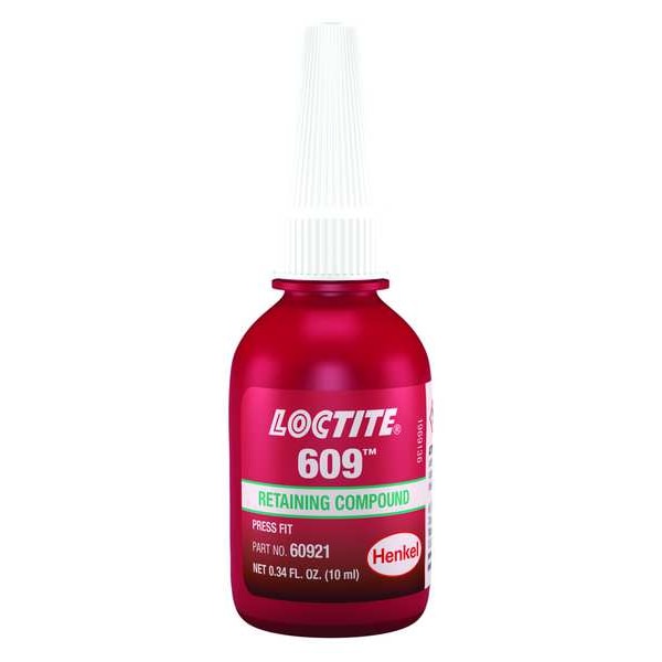 Retaining Compound, For Material Type Steel, Retaining Compounds Properties For Close Fitting Parts, Series 609, Container Size 0.3 fl oz, Container Type Bottle, Maximum Gap Fill Size 0.006 in, Working Time 10 min, Maximum Operating Temperature 300 Degrees F, Minimum Operating Temperature -65 Degrees F, Color Green, Full Cure Time 1 day, Shear Strength 2,290 psi, Standards 29 CFR 1910.1200, Primer Required Yes, Chemical Base Methacrylate Ester, Clean Up Method Solvent, Wire Brush