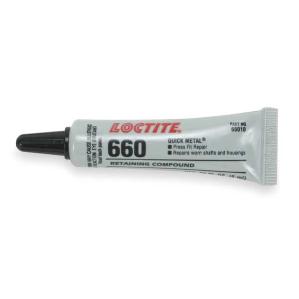 Retaining Compound, For Material Type Steel, Retaining Compounds Properties For Loose Fitting Parts, Series 660, Container Size 0.2 fl oz, Container Type Tube, Maximum Gap Fill Size 0.02 in, Working Time 15 min, Maximum Operating Temperature 300 Degrees F, Minimum Operating Temperature -65 Degrees F, Color Silver, Full Cure Time 1 day, Shear Strength 2,490 psi, Standards 29 CFR 1910.1200, Primer Required Yes, Chemical Base Urethane Methacrylate, Clean Up Method Solvent, Wire Brush