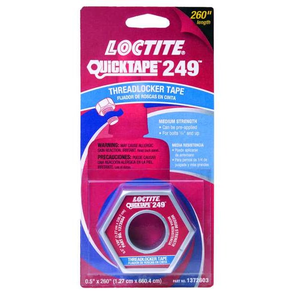 Threadlocker Tape, For Material Type Brass, Bronze, Copper, Iron, Manganese, Monel, Nickel, Steel, Threadlocking Strength Medium, Color Blue, Series 249, Container Type Roll, For Maximum Thread Diameter 2 in, Breakaway Torque 70 in-lb, Compatible Primer Series Loctite 7649, Threadlocker Properties No-Drip, Standards ASTM D-5648, ISO 10964, Clean Up Method Solvent, Wire Brush, Compatible Primer (Grainger Part Number) 4KL11, Maximum Operating Temperature 350 Degrees F