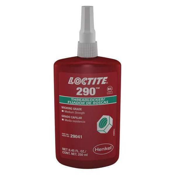 Wicking Medium-Strength Threadlocker, For Material Type Brass, Bronze, Copper, Iron, Manganese, Monel, Nickel, Steel, Threadlocking Strength Medium, Color Green, Series 290, Container Size 8.45 fl oz, Container Type Bottle, For Maximum Thread Diameter 1/2 in, Working Time 20 min, Breakaway Torque 90 in-lb, Cure Type Anaerobic, Compatible Primer Series Loctite 7649, Threadlocker Properties Wicking