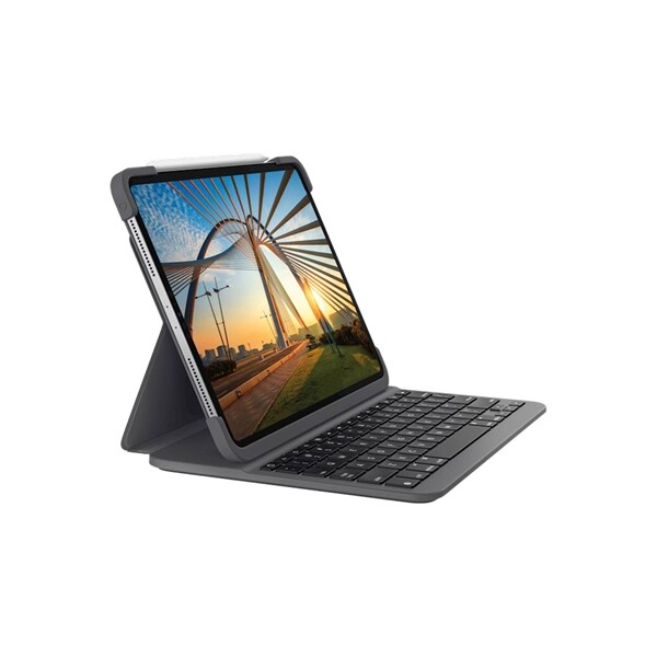 This LOGITECH Slim Folio Pro Ipad Pro is a keyboard/cover case with a folio style. It has a fabric exterior and a magnetic closure type. Its dimensions are 11.3" in width, 9.1" in height, and 0.9" in depth.