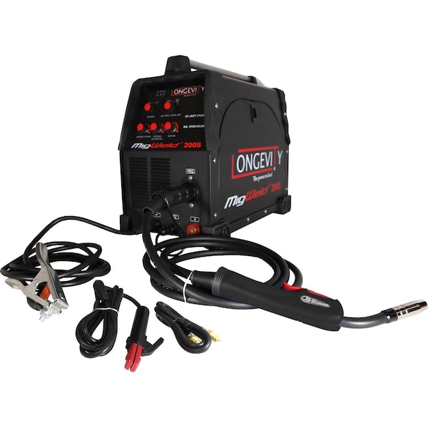 The Longevity MIGWELD 200S is built to tackle any challenge it faces without compromising its excellent performance. Built with reliable inverter technology, we continue to revolutionize the MIG welder market. MIGWELD 200S allows you to weld all exotic metals including aluminum with the addition of the Spool Gun. The splatter on the MIGWELD series is minimized and the post clean of the finished weld is quick and easy. In addition, the ability to adjust the arc with the Arc Force to reduce the spatter and improve the overall welding performance and characteristics is an excellent option to lay down a quality weld. Specifications: • All the adjustments are grouped and coded together which allows the user to see the settings quickly and make necessary adjustments easily • Weld any material, including aluminum! Simply plug the spool gun cable to the Euro connector, connect the remote trigger, and you are ready to weld aluminum! • With a 60% duty cycle, the MIGWELD 200S is perfect for light industrial applications and for welders whose primary concern is portability and efficiency • Thermal overload protection will safely shut down your machine until proper cooling to avoid any damage • The MIGWELD 200S comes with a mild steel 2 lb welding wire roll, welding mask, chipping hammer, welding brush, and gas regulator