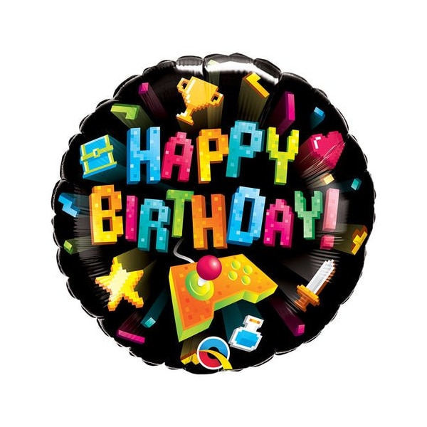 Celebrate that special someone's birthday with this fun 18 inch round Birthday Gaming foil mylar balloon! Combine a couple of these 18 inch balloon designs with a few of our birthday latex balloons to create a bouquet cluster to give someone as a special gift or to use as birthday party decor. This balloon includes a self-sealing valve, preventing the gas from escaping after it's inflated. The balloon can be inflated with helium to float or with a balloon air inflator. Balloon arrives uninflated.