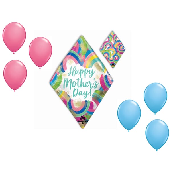 Mother's Day theme balloon set variety. The balloons can be inflated with helium to float. Balloon arrives uninflated. The set includes; Mother's Day Theme Balloon Set, 25 Inch Anglez Mother's Day Painted Rainbows Balloon, Mother's Day 6x pcs Latex Balloons