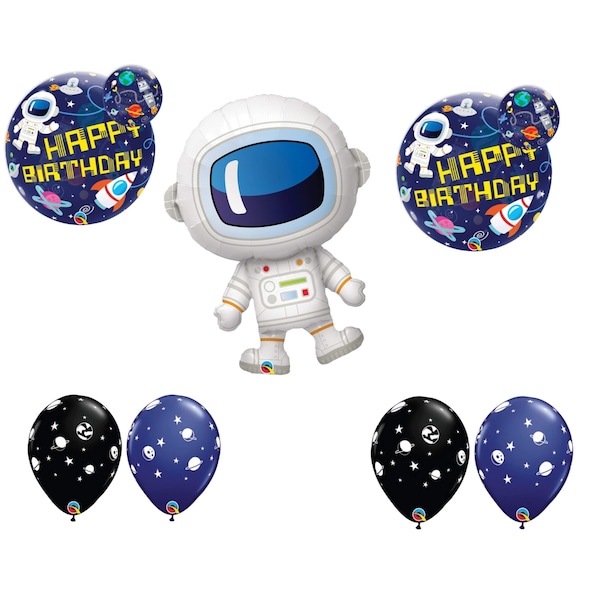 Space, Alien, Rocket theme balloon set variety. The balloons can be inflated with helium to float. Balloon arrives uninflated. The set includes; 37 Inch Adorable Astronaut Balloon, 22 inchBirthday Outer Space Bubble Balloons