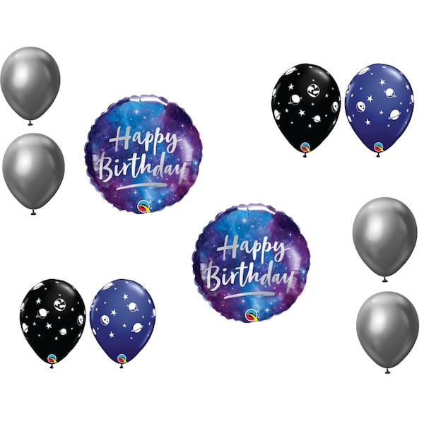 Space, Alien, Rocket theme balloon set variety. The balloons can be inflated with helium to float. Balloon arrives uninflated. The set includes; Standard Birthday Galaxy Balloon and 8x latex balllons