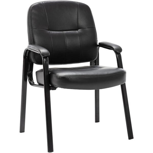 Executive guest chair offers a sophisticated look for any lobby, reception area or conference room. Design features fully upholstered seating with black, split leather for a rich classic look. Guest chair features stylish open loop arms and a black steel frame. Seat height is 18-3/4in. Chair meets the CA117 fire-retardant standard.