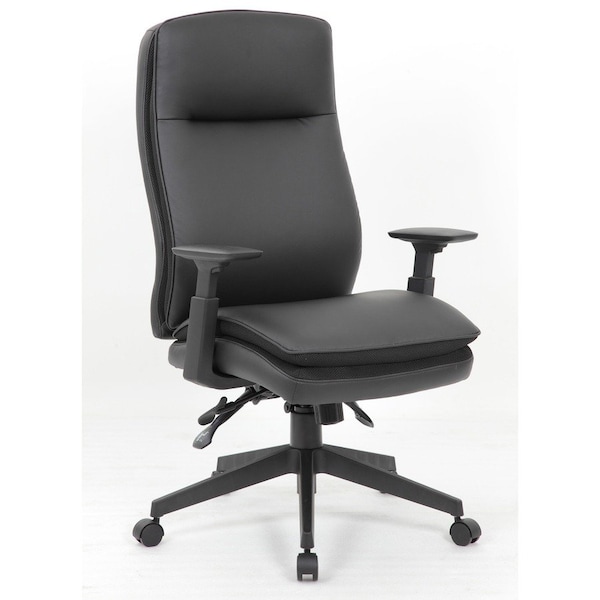High-back executive chair brings comfort and stability to any office environment. It features durable, premium vinyl upholstery and high-back styling with exemplary lumbar support. Arms adjust in height from 24" to 30" for best positioning. Executive chair also features pneumatic gas lift seat-height adjustment from 19-1/2" to 22-1/2", 360-degree swivel, adjustable tilt tension control, spring tilt mechanism, and ability to lock in the upright position. Large 27", five-star nylon base provides stability while affording plenty of mobility thanks to its five hooded, double-wheel casters. Seat size is 20" wide x 18-1/2" deep. Back size is 20" wide x 28" high. Weight capacity is 275 lb.