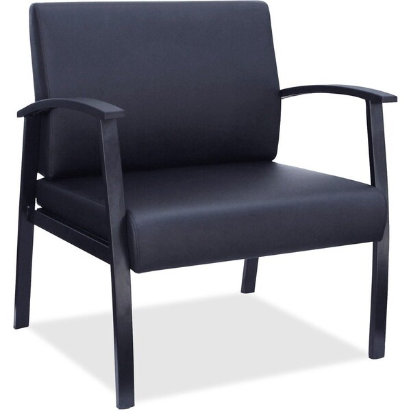 With bonded black leather upholstery and a sturdy steel frame, this Big & Tall Guest Chair provides inviting seating for your reception area or office. Thickly padded seat offers a 450 lb. weight capacity. Cushioned back features built-in lumbar support. Steel frame and arm construction provides durability and strength. Adjustable leg sliders on the four-leg base allow leg leveling on uneven floors. Easily assemble chair using the chair's unique locking system. Assembly requires no tools.