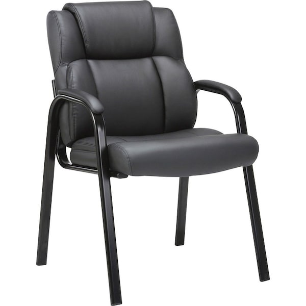 Guest chair coordinates with Lorell Bonded Leather High-back Chairs for luxurious comfort in your waiting room or office. Both cushioned seat and back are upholstered with black bonded leather. Loop fixed arms feature upholstered pads for extra comfort. Durable steel frame features a four-leg base and powder-coated finish.