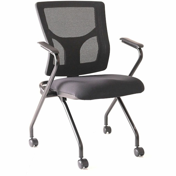 Conjure Mesh Training Chairs with arms and back tilt hinge offer the same support of Conjure Executive Chair with high-strength mesh backs and polyurethane molded foam seats covered in fabric. Seats fold for easy nesting. Frames are equipped with nylon casters for quick setup and takedown in temporary training areas. Fixed arms and black powder-coated metal legs deliver reliable support. Weight capacity is 275 lb.