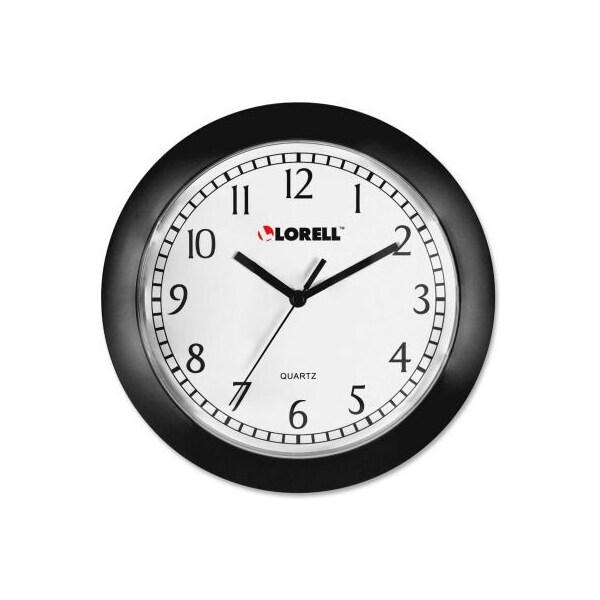 Lorell 9" round quartz wall clock, plastic case, black round wall clock offers quartz movement for accurate time. Design features a black frame, easy-to-read white dial, black arabic numerals, black second hand sweep and abs plastic cover. Interior diameter is 7". Clock runs on one aa battery (sold separately).