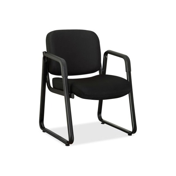 Lorell black fabric guest chair - black with fabric-upholstered, padded seat and back, this guest chair offers deluxe comfort for your waiting room. Sturdy construction features a plywood core for the seat and back, black plastic arm caps and metal frame with a powder-coat finish. Sled base with stabilizing feet offers a balanced, supportive foundation for your guests. Weight capacity is 275 lb. Chair meets or exceeds ansi/bifma standards.