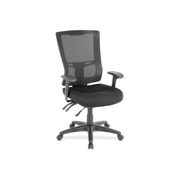Lorell high-back mesh chair - black mesh high-back chair features a high-strength, elastic, nylon mesh back and a fabric-upholstered seat. Two-way adjustable armrests offer black polypropylene arm coverings. Seat and back angles can adjust independently. Other functions include ratchet back, pneumatic seat-height adjustment from 18" to 21-3/4" and 360-degree swivel. The 26" diameter, five-star base is made of reinforced nylon and is equipped with 50mm hooded, dual-wheel casters for easy mobility. Weight capacity is 250 lb. Seat measures 20-9/10" wide x 21-3/10" deep. Back size is 20-7/10" wide x 24" high. Headrest is sold separately.