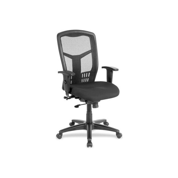 Lorell high-back mesh executive chair - black mesh high-back chair offers a mesh back and seat with plastic-coated steel frame. Ergonomically designed back accommodates the natural curvature of person's back. Arms with polyurethane arm pads adjust in height and width. Functions include pneumatic seat-height adjustment from 18" to 21-1/2", seat-glide mechanism, 360-degree swivel and tilt tension. High-back chair meets the ca117 fire-retardant standard.