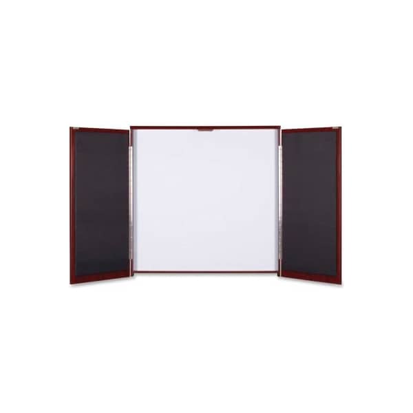 Lorell presentation cabinet offers an elegant solution for your meeting needs. Hinged doors close to hide the dry-erase surface inside and possibly your important brainstorming. The 18mm laminate doors with 2mm matched edge banding are lined in black fabric tack boards for more meeting tools. The internal melamine whiteboard supplies the dry-erase surface. Cabinet includes cleat mounting hardware.