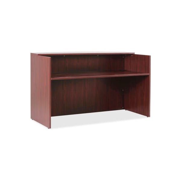 Lorell essentials series mahogany laminate desking, 35.4" x 70.9" x 42.5" desk front reception desk promotes work efficiency while projecting a professional image for greeting visitors. It is part of the lorell essentials series wood laminate furniture with high-quality laminate construction and a contemporary design. High sides surround the desktop on three sides and extend to the floor to provide privacy for confidential documents and details. The built-in counter above the desktop acts as writing support and platform for connecting with customers or patients. Desktop and counter feature 1" thick laminated tops for durability. view the essentials collection here.