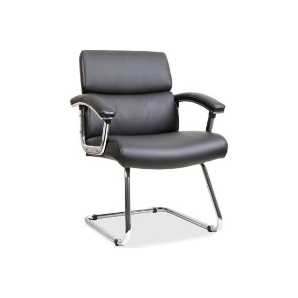 Lorell sled base leather guest chair - black guest chair features bonded leather upholstery over thickly cushioned seating for deluxe comfort and style. Fixed chrome steel arms also feature a soft upholstery pad. Sled base is made of steel with a shiny chrome finish. Weight capacity is 250 lb. Seat measures 19-1/8" wide x 17-3/4" deep x 18-1/8" high. Back dimensions are 20-1/14" wide x 22-1/4" high.