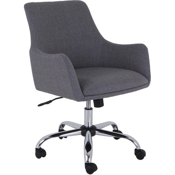 Mid-century modern-inspired task chair with low-profile arms is upholstered with stylish fabric upholstery for a professional look. Seat and back are cushioned for comfort. Functions include adjustable seat height from 18-1/4in to 22-1/4in, 360-degree swivel, tilt tension adjustment and tilt/tilt lock. Chrome steel base is equipped with dual-wheel casters for easy movement.