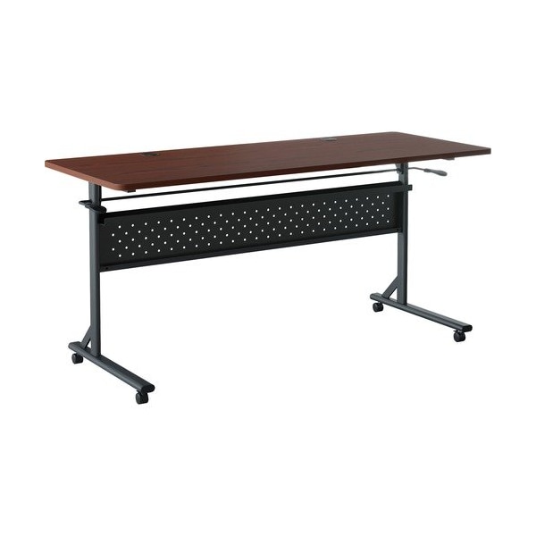 Shift 2.0 Flip and Nesting Mobile Table is perfect for the training or conference room. Rectangular top flips up with a simple lever mechanism to nest with other tables for space-saving storage. Improved 1in thick top is made of scratch-resistant laminate with rounded corners. A plastic grommet is positioned near both ends for convenient cord management. Table includes sturdy steel frame with perforated modesty panel and storage channel. It rolls easily on four casters two locking.