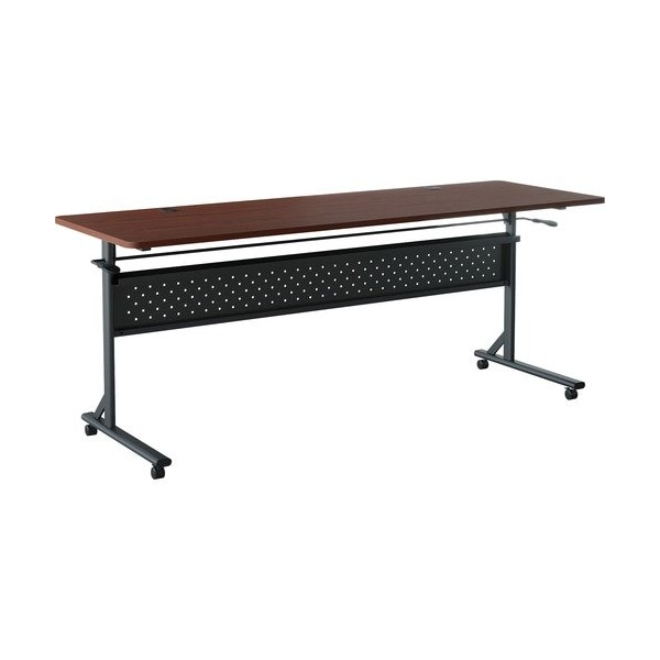 Shift 2.0 Flip and Nesting Mobile Table is perfect for the training or conference room. Rectangular top flips up with a simple lever mechanism to nest with other tables for space-saving storage. Improved 1in thick top is made of scratch-resistant laminate with rounded corners. A plastic grommet is positioned near both ends for convenient cord management. Table includes sturdy steel frame with perforated modesty panel and storage channel. It rolls easily on four casters two locking.