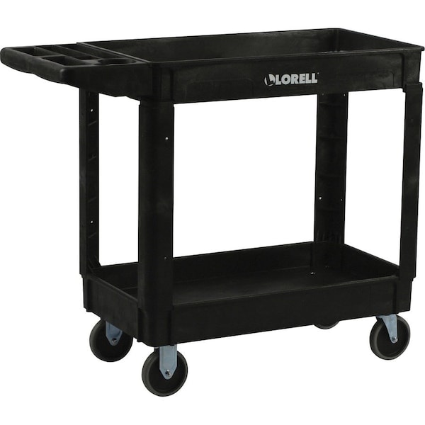 Use this utility cart for transporting equipment, tools and heavy loads in any environment. It is tough enough for material handling and maintenance. Sturdy, structure foam construction won't rust, dent, chip or peel easily. Built-in storage bin in the handle is the perfect way to store small parts. Rounded corners protect walls and furniture. Lightweight, maneuverable cart moves easily on two 5" rigid casters and two 5" swivel casters all in thermoplastic rubber. It holds up to 550 lb.