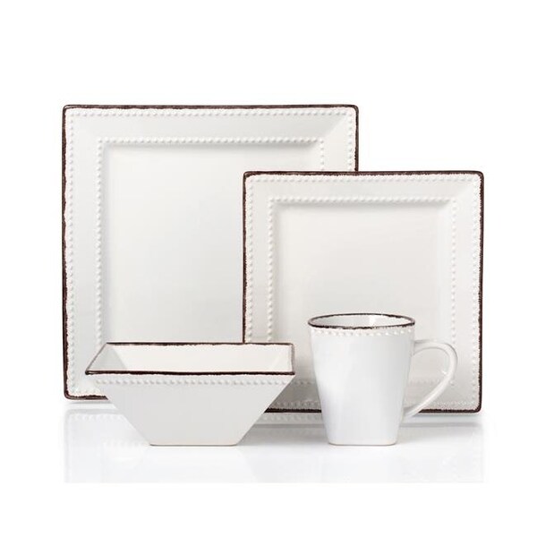 This 16 piece stoneware set from Lorren Home Trends is decorated in a double beaded border design. Border is painted in a brown trim creating a framed modern look. Classice bright white color with the brown contrast adds a rich and fun updated look to your table setting. Square shape is ideal for creating a modern but classy ambiance. Sturdy and durable stoneware quality from Lorren Home Trends is a perfect way to decorate with color and style. 16 piece set includes: 4-Dinner plates 10.5"x10.5"x1" (weighs 2.25 pounds), 4-Soup Bowls 6.5"x6.5"x2.5" (holds 20 ounce and weighs 1 pound), 4-Salad plates 8.25"x8.25"x.75" (weighs 1.35 pounds) 4- 8oz. Mugs 4.5"x3.5"x4" (weighs .75 pounds). Dishwasher and Microwave Safe.